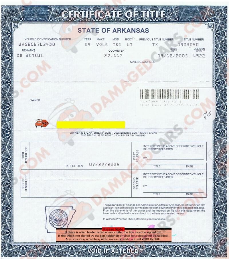 Arkansas titles have a seller signature location on both the front AND the back of the title. The correct location on the front of the Arkansas title is in the very center of the document and is marked "Owner Signature". The second signature location is on the rear of the Arkansas title, near the center. The signature location is marked "Signature and Address of Seller". Please do not sign in any other locations.