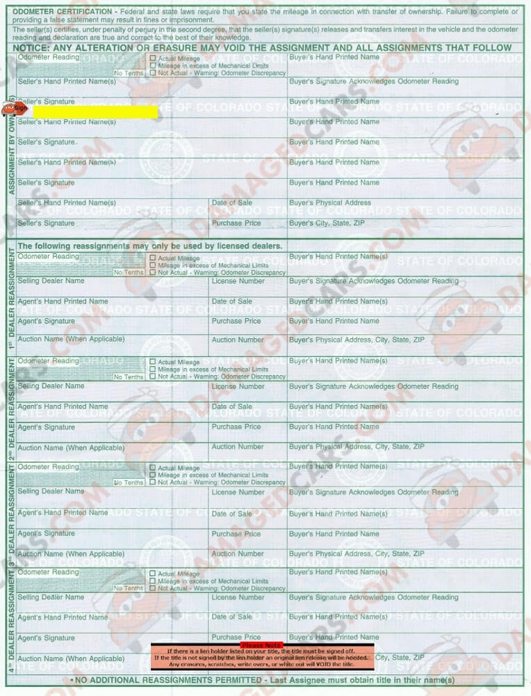 The seller signature location is on the back of the Colorado Title in the upper left corner. The correct location for the seller to sign is marked "Sellers Signature". Please do not sign in any other location.